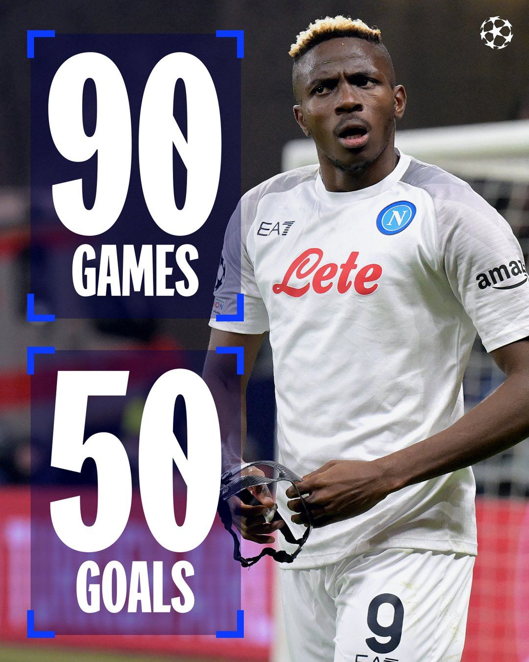 玩球网3月16日讯那不勒斯vs法兰克福的欧冠1/8决赛次回合比赛正在进行当中,那不勒斯暂时1-0领先,奥斯梅恩破门。StatmanDave数据统计,奥斯梅恩在那不勒斯仅用90场比赛就达成50球里程碑,