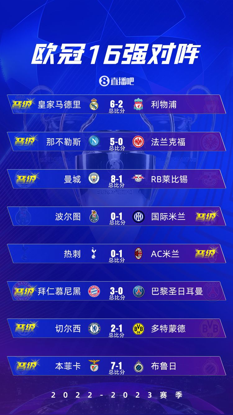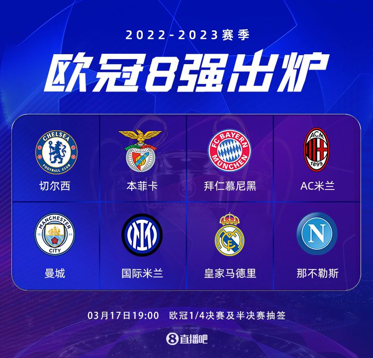 玩球网3月16日讯22/23赛季欧冠8强出炉,皇马、曼城、拜仁晋级,意甲三队全部成功突围!欧冠8强名单:切尔西、本菲卡、拜仁、AC米兰、曼城、国米、皇马、那不勒斯。相关阅读:欧冠8强联赛分布:意甲三队