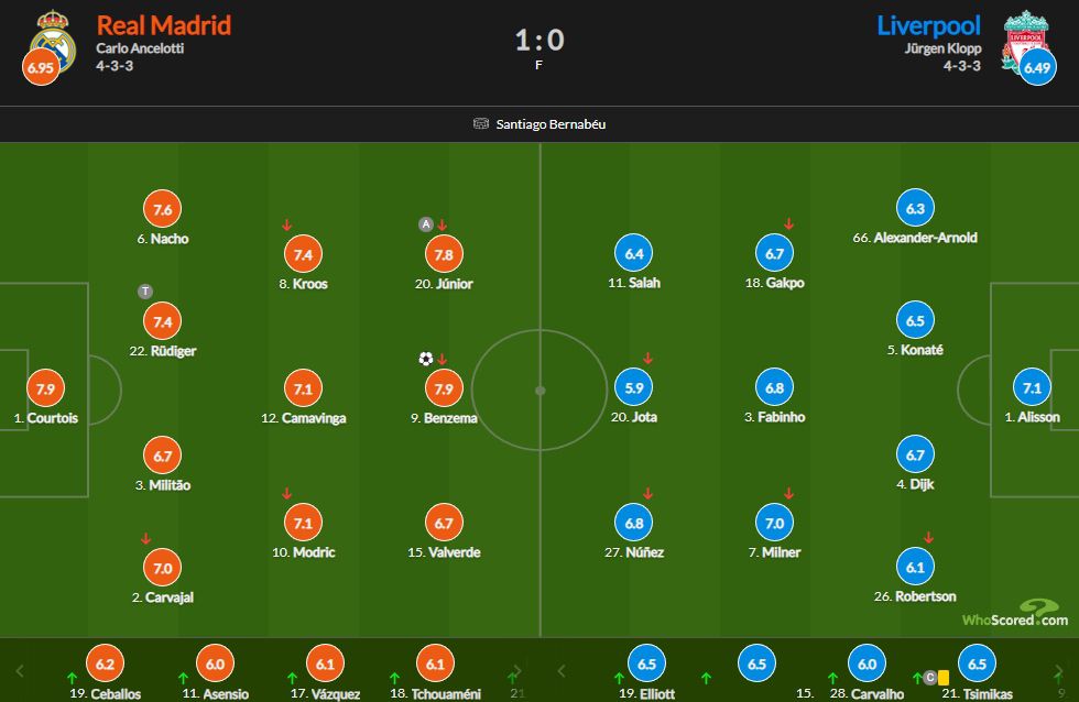 玩球网3月16日讯在刚刚结束的欧冠淘汰赛中,皇马1-0利物浦,总比分6-2晋级欧冠八强。赛后whoscored为本场球员打出评分。本泽马和库尔图瓦均获得了7.9分,并列全场最高。以下是详细评分:皇马: