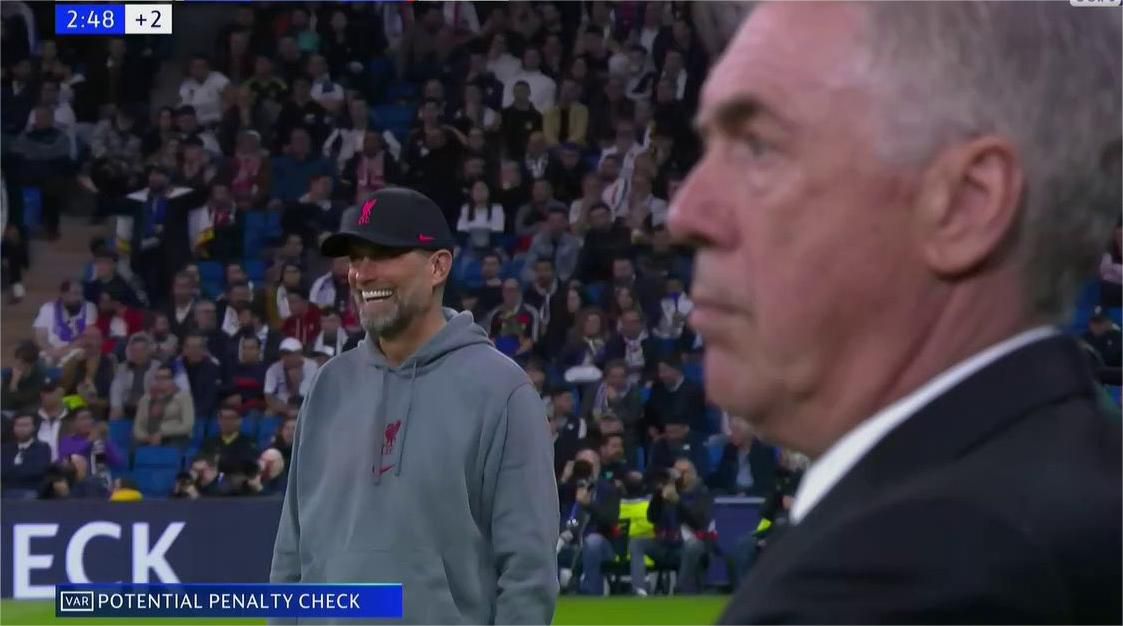 补时阶段,VAR检查利物浦球员的疑似手球,最终判定不是点球。VAR检查期间,场边的克洛普无奈苦笑。