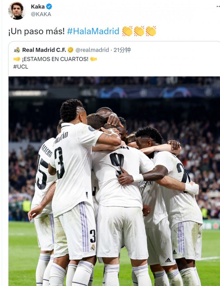 卡卡在社交媒体上转发皇马官方庆祝胜利的动态,写道:“又前进一步!”并附上了鼓掌的表情符号。