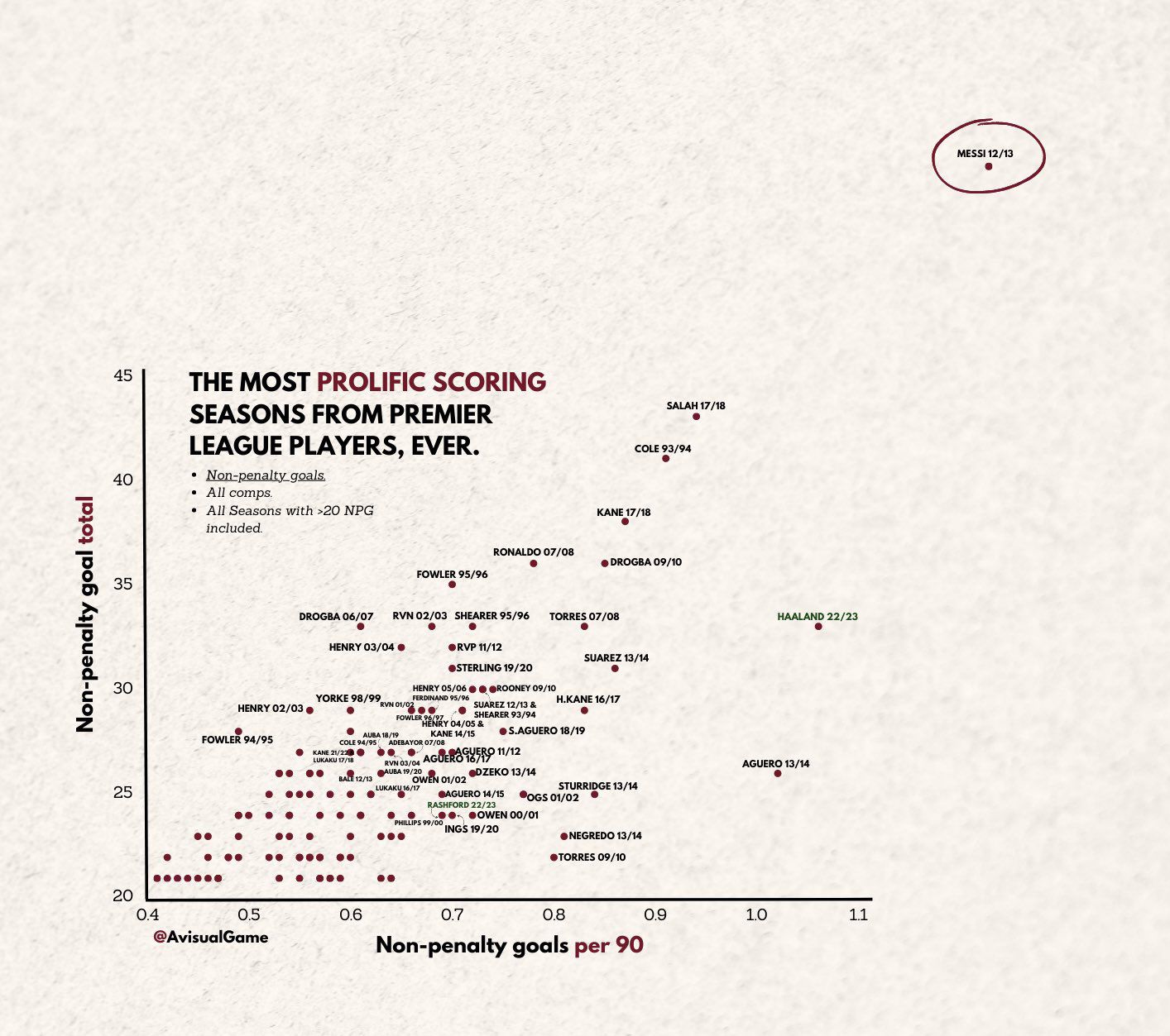 玩球网3月16日讯数据博主VisualGame昨日晒出一张图,表示哈兰德有望创造英超球员非点球进球纪录。 图中为哈兰德与多名英超球员在打进超20个球(非点球)的对比。 随后,博主又添加一张图,写道:与往常一样,我想加上梅西的12-13赛季。图完全按比例缩放 |