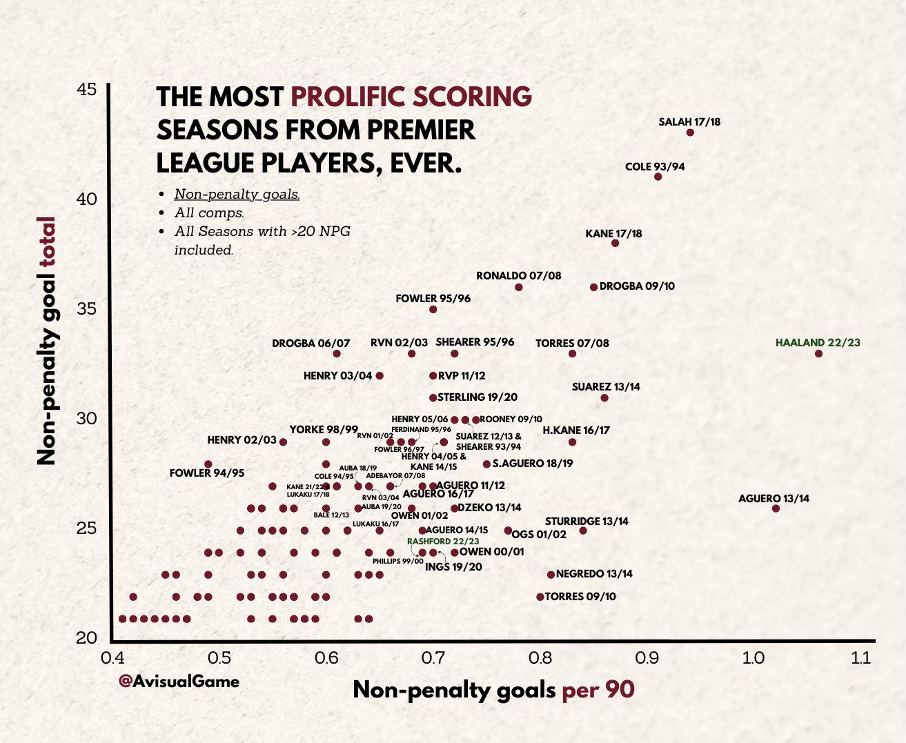 玩球网3月16日讯数据博主VisualGame昨日晒出一张图,表示哈兰德有望创造英超球员非点球进球纪录。图中为哈兰德与多名英超球员在打进超20个球(非点球)的对比。随后,博主又添加一张图,写道:与往常