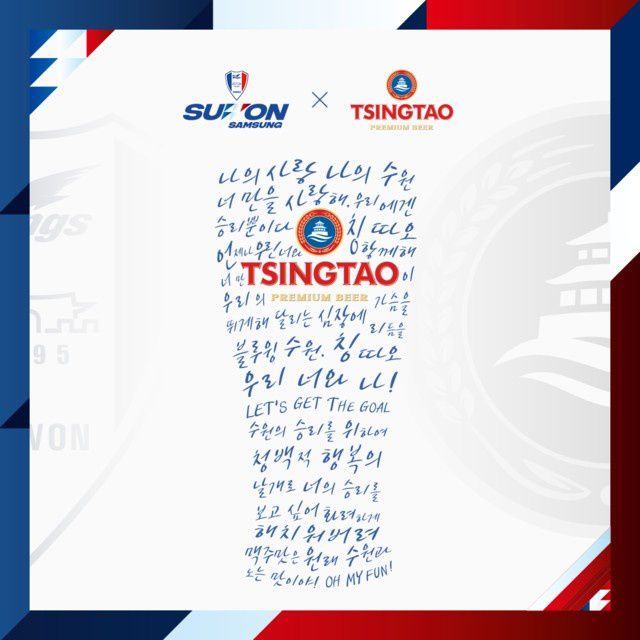 玩球网3月16日讯K联赛水原三星官方消息,青岛啤酒时隔3年再度赞助球队。青岛啤酒曾于2016年-2020年赞助水原三星俱乐部,当时双方举办了一系列促销活动,而水原球迷也自发开展“如果你是水原球迷,就喝