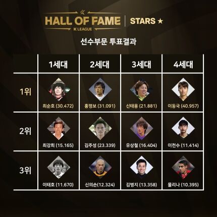 玩球网3月16日讯 为纪念K联赛成立40年,韩国职业足球联合会今年开设名人堂。今天,韩国职业足球联合会公布了首批名人堂成员。 崔淳镐: 83-87年效力浦项铁人,88-90年效力幸运星,91年效力浦项铁人,首届(84年)K联赛最佳阵容 洪明甫: 92-97年效力浦项铁人,02年效力浦项铁人,K联赛MVP 1次(92年),最佳阵容5次(92,94,95,96,02) 申台龙: 92-94年效力城南,K联赛MVP 2次(95,01),最佳射手1次(96),最佳阵容9次(92,93,94,95,96,00,01,02,03) 李同国: 98-02年效力浦项铁人,03-05年效力尚武,05-06年效力浦项铁人,08年效力城南,09-20年效力全北。K联赛MVP 4次(09,11,14,15),最佳新人1次(98),最佳射手1次(09),助攻王1次(11),最佳阵容5次(09,11,12,14,15) 金正男教练: 00-08年执教蔚山现代,2次K联赛冠军(89,05),K联赛最佳教练(89) (德里森) |
