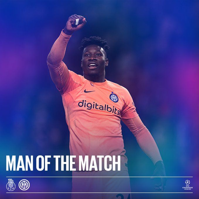 玩球网3月16日讯国米官方宣布,奥纳纳当选欧冠客战波尔图一役国米队内最佳球员。国米在欧冠1/8决赛次回合比赛中客场0比0战平波尔图,以1比0的总比分晋级,恰尔汗奥卢、奥纳纳、达米安、迪马尔科是国米此役