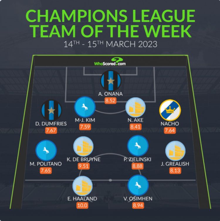 玩球网3月16日讯本周四场欧冠1/8决赛次回合比赛战罢,WhoScored根据评分列出了本周欧冠最佳阵容,哈兰德10分领衔,奥斯梅恩、金玟哉在列。WhoScored本周欧冠最佳阵容门将:奥纳纳(国米)