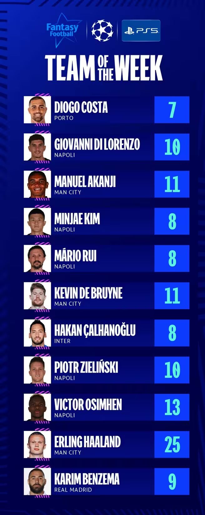 玩球网3月16日讯本周欧冠进行了四场1/8决赛次回合对决,欧冠官方今日公布本周最佳阵容,哈兰德、本泽马在列,那不勒斯五人入选。最佳阵容如下:门将:迪奥戈-科斯塔(波尔图)后卫:迪洛伦佐(那不勒斯)、阿
