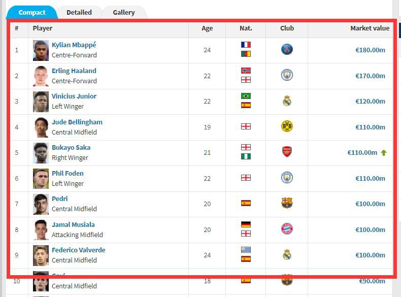 玩球网3月16日讯德转今日更新球员身价,更新之后,身价过亿的球员有9名,其中皇马、曼城各有两人,巴黎圣日耳曼、多特蒙德、阿森纳、巴萨、拜仁各一人,具体如下: 1.姆巴佩(巴黎圣日耳曼):1.8亿欧元 2.哈兰德(曼城):1.7亿欧元 3.维尼修斯(皇马):1.2亿欧元 4.贝林厄姆(多特蒙德):1.1亿欧元 5.萨卡(阿森纳):1.1亿欧元 6.福登(曼城):1.1亿欧元 7.佩德里(巴萨):1亿欧元 8.穆西亚拉(拜仁):1亿欧元 9.巴尔韦德(皇马):1亿欧元 (半场mua醒) |