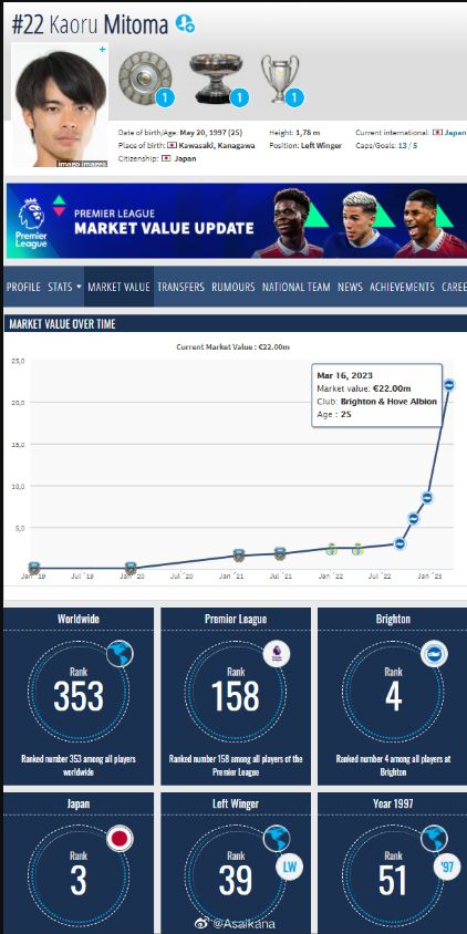 三笘薰最新身价:2200万欧。更新历史:2019.01——5万欧2019.12——5万欧2021.01——160万欧2021.06——180万欧2022.01——250万欧2022.04——250万欧