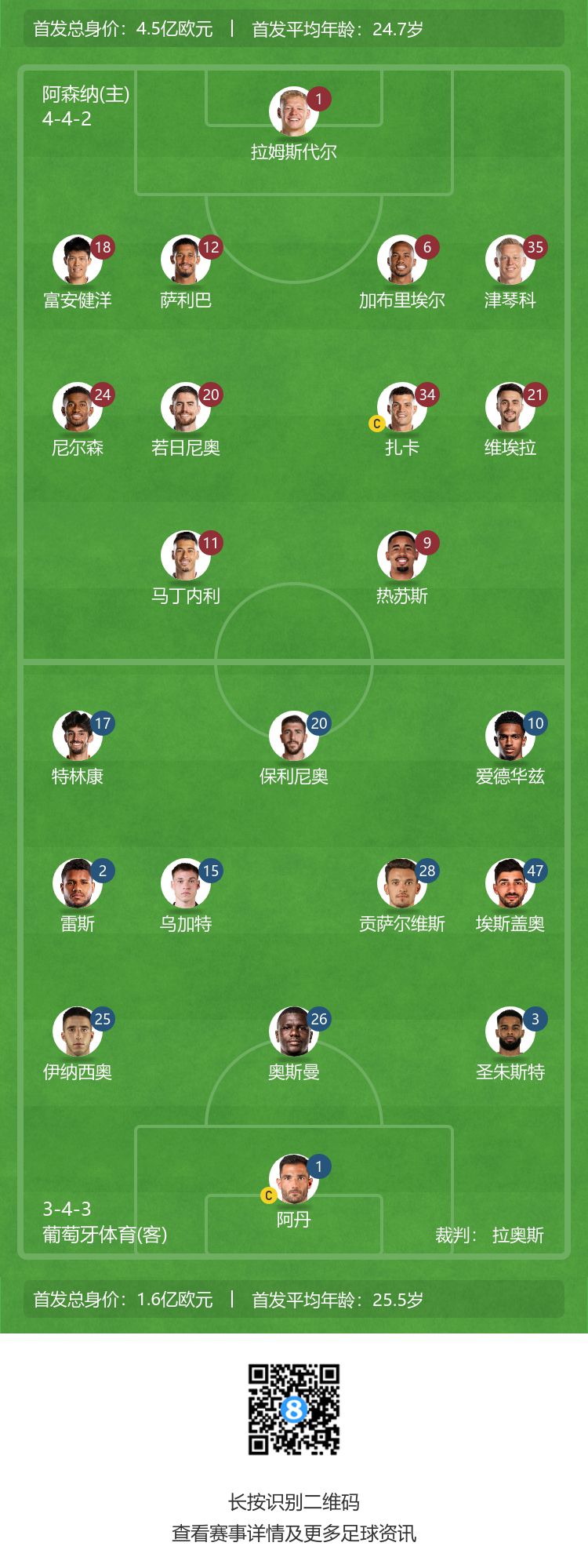 玩球网3月17日讯欧联杯1/8决赛次回合,阿森纳主场对阵葡萄牙体育。赛前,官方公布了本场的首发名单。 阿森纳首发:1-拉姆斯代尔、35-津琴科、6-加布里埃尔、12-萨利巴、18-富安健洋、20-若日尼奥、34-扎卡、21-维埃拉、24-尼尔森、9-热苏斯、11-马丁内利 阿森纳替补:30-马特-特纳、56-希尔森、3-蒂尔尼、4-本-怀特、5-托马斯、7-萨卡、8-厄德高、10-史密斯-罗、15-基维奥尔、16-霍尔丁、19-特罗萨德 葡体首发:1-阿丹、2-雷斯、3-圣朱斯特、10-爱德华兹、15-乌加特、17-特林康、20-保利尼奥、25-伊纳西奥、26-迪奥曼德、28-贡萨尔维斯、47-埃斯盖奥 葡体替补:12-伊斯雷尔、6-亚历山德罗普洛斯、11-努诺-桑托斯、13-路易斯-内托、16-罗西尼亚、18-法塔武、32-坦隆戈、33-阿图尔-戈麦斯、77-卡布拉尔、79-切尔米蒂、82-马特乌斯-费尔南德斯、84-埃苏戈 (夜神) |