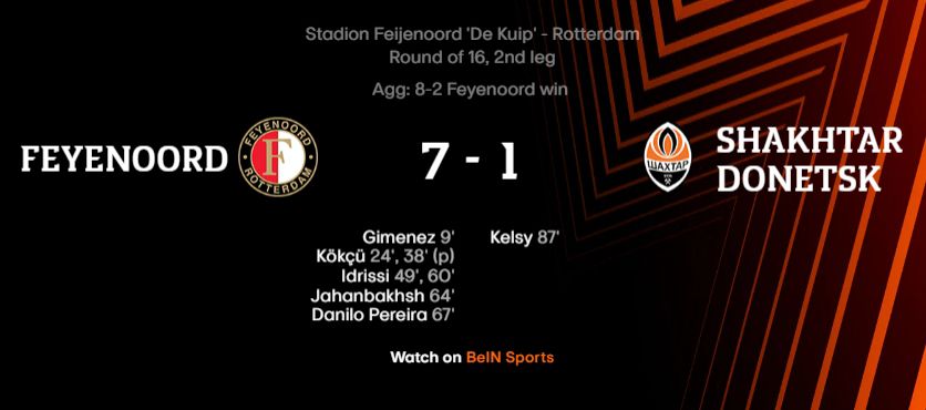 玩球网3月17日讯在北京时间3月17日凌晨结束的欧联杯1/8决赛次回合比赛中,费耶诺德主场7-1大胜顿涅茨克矿工,总比分8-2晋级欧联杯八强。据Opta统计,此次费耶诺德收获的一边倒的7-1大胜,是荷
