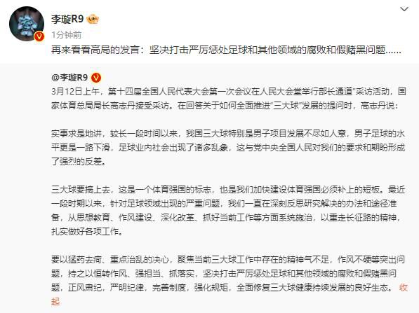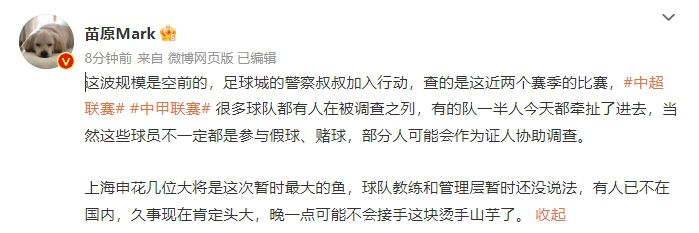 足坛反腐风暴迎来新进展!今日纪检联合警方现身上海成都两地进行赌球调查,在集训的中超中甲球队被带走多位球员和名宿! 据爆料,被带走的人包括国脚金敬道、山东名宿矫喆、申花球员朱建荣、孙世林、秦升。 以下是主要媒体记者消息汇总↓ 记者程文莉先在社媒暗示,足坛反腐可能有新进展???? 警方今早现身上海某基地进行赌球调查,这次直捣庄家! 媒体人徐江也疑似做出类似暗示,随后删除微博。 搜狐记者裴力也暗示上海方面有事发生。 根据此前消息的整理,目前在上海集训的中超球队除了上海海港、申花外,还有山东泰山、大连人、南通支云。 媒体人杜立言则透露,有中超中甲的球员失联,其中有一位前辽足门将。 后续爆料称,这位前辽足门将是张振强↓ 随后,据申花博主了解到了被带走的球员↓ (随后该博主删除了这条内容) 还有多位守门员失联 记者程文莉继续透露,此次行动是专门针对赌球的,多位球员、名宿落网。 媒体人李平康称,有个被带走的,如果没有吴兴涵的事,至少应该没这么快被抓 媒体人贺晓龙表示,某国脚是赌球的组织者 媒体人苗原透露,有球队一半的人都牵扯进去了 媒体人徐江再次补充,在成都集训的球队也被带走多人 |