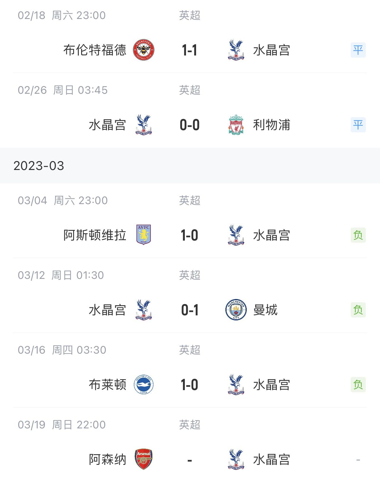 2023年,水晶宫各项赛事5平7负,未尝一胜,这是维埃拉下课的直接原因,球队目前积27分排名英超第12,不过仅领先降级区3分。