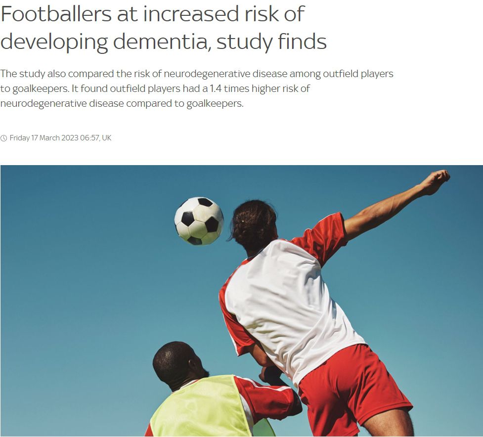 玩球网3月17日讯根据天空体育消息,瑞典的一项研究表明,球员患神经退行性疾病(主要有脑萎缩、老年痴呆症、帕金森综合征以及肌肉萎缩侧索硬化等)的风险是普通人的一倍半。瑞典卡罗林斯卡学院和其他一些研究中心