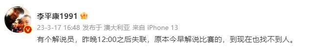 据媒体人李平康透露:“有个解说员,昨晚12:00之后失联,原本今早解说比赛的,到现在也找不到人。 ”