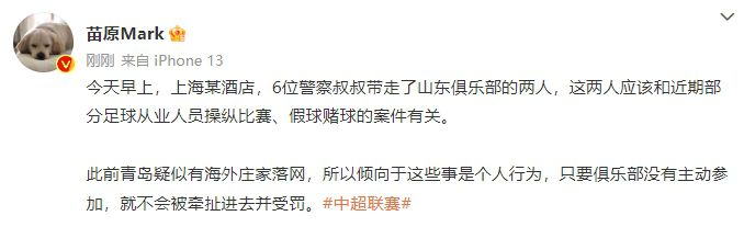 玩球网3月17日讯今日中国足坛再度“狂飙”,媒体称多名球员被抓。据媒体人苗原消息:“今天早上,上海某酒店,6位警察叔叔带走了山东俱乐部的两人,这两人应该和近期部分足球从业人员操纵比赛、假球赌球的案件有