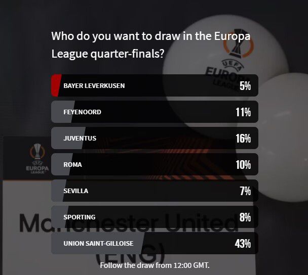 玩球网3月17日讯在曼联欧联杯16强淘汰贝蒂斯晋级8强后,在曼联官网上进行了曼联欧联八强战中球迷希望的下一个对手的投票活动,经过投票,有43%的球迷希望抽到圣吉罗斯是最多的。曼联官网组织的球迷希望的曼