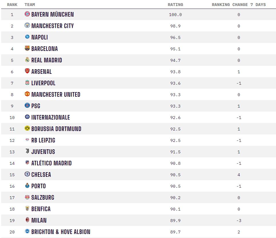 玩球网3月17日讯 欧冠1/4决赛对阵出炉,具体对阵为:皇马vs切尔西,本菲卡vs国米,曼城vs拜仁,AC米兰vs那不勒斯。 在OPTA给出的球队实力排行榜中,拜仁和曼城占据头两名,他们将在1/4决赛中正面对决 ;而米兰与那不勒斯的对决则是排名相差最大的对决:米兰在榜单中排名19,而那不勒斯则高居第3。 此外,皇马在榜单中排名第5,他们将对战排名15的切尔西;与排名第10的国米较量的本菲卡在榜单上列第18位。 OPTA实力榜(3月17日更新)前20↓ (半场mua醒) |