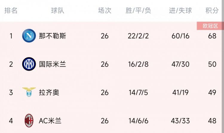 值得一提的是,那不勒斯目前积68分排名意甲榜首,领先排名第四的米兰20分之多。