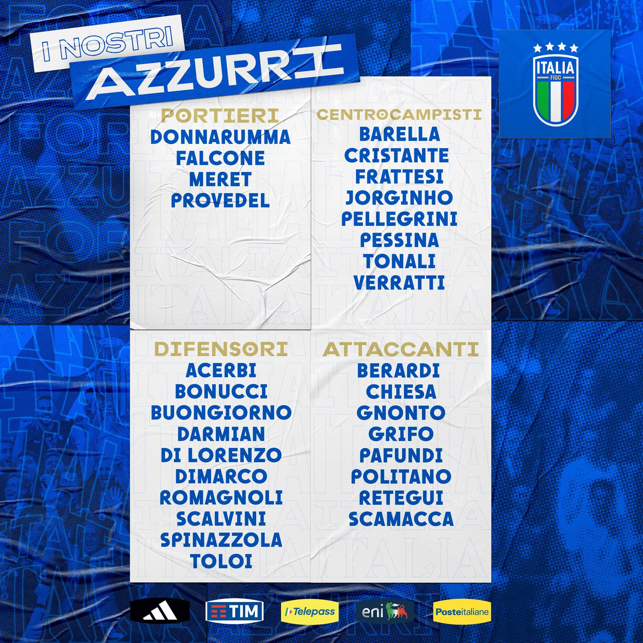 玩球网3月18日讯 意大利公布了欧预赛对阵英格兰、马耳他的30人名单,具体如下。 门将:多纳鲁马(巴黎)、法尔科内(莱切)、梅雷特(那不勒斯)、普罗维德尔(拉齐奥) 后卫:阿切尔比(国米)、博努奇(尤文)、布翁乔尔诺(都灵)、达米安(国米)、迪洛伦佐(那不勒斯)、罗马尼奥利(拉齐奥)、斯卡尔维尼(亚特兰大)、斯皮纳佐拉(罗马)、托洛伊(亚特兰大)、迪马尔科(国米) 中场:巴雷拉(国米)、克里斯坦特(罗马)、弗拉泰西(萨索洛)、若日尼奥(阿森纳)、佩莱格里尼(罗马)、佩西纳(蒙扎)、托纳利(AC米兰)、维拉蒂(巴黎) 前锋:贝拉尔迪(萨索洛)、基耶萨(尤文)、格诺托(利兹联)、格里福(弗赖堡)、帕方迪(乌迪内斯)、波利塔诺(那不勒斯)、雷特古伊(老虎竞技)、斯卡马卡(西汉姆联) |