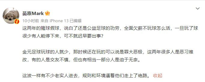 昨日多名媒体人爆料,警方现身上海、成都两地调查赌球,集训的中超中甲球队被带走多位球员和名宿。 媒体人苗原对此评价道,这两年的赌球假球,相当一部分人是迫于无奈,说白了还是公益足球的功劳,全面欠薪不玩球怎么活? 苗原原文如下: 这两年的赌球假球,说白了还是公益足球的功劳,全面欠薪不玩球怎么活,一旦玩了球很少有人能停下来,可不就迟早要出事? 金元足球玩球的人就少,那时候还在玩的可以说是罪大恶极,这两年很多人是恶习难改,有的人是交友不慎,但也有相当一部分人是迫于无奈。 这波一样有不少老实人进去,规则和环境逼着他们走上了绝路。 继续狂飙!警方调查赌球,多名球员落网 |