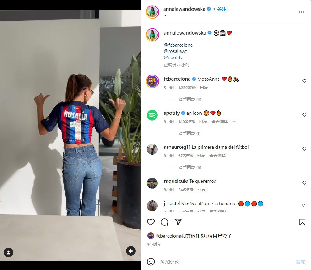 玩球网3月18日讯作为与Spotify商业合作的一部分,巴萨将在本赛季西甲第二场国家德比中身穿印有西班牙歌星罗莎莉亚(Rosalia)标志的球衣出战。莱万妻子安娜今日在ins晒出一段视频,视频中她身穿