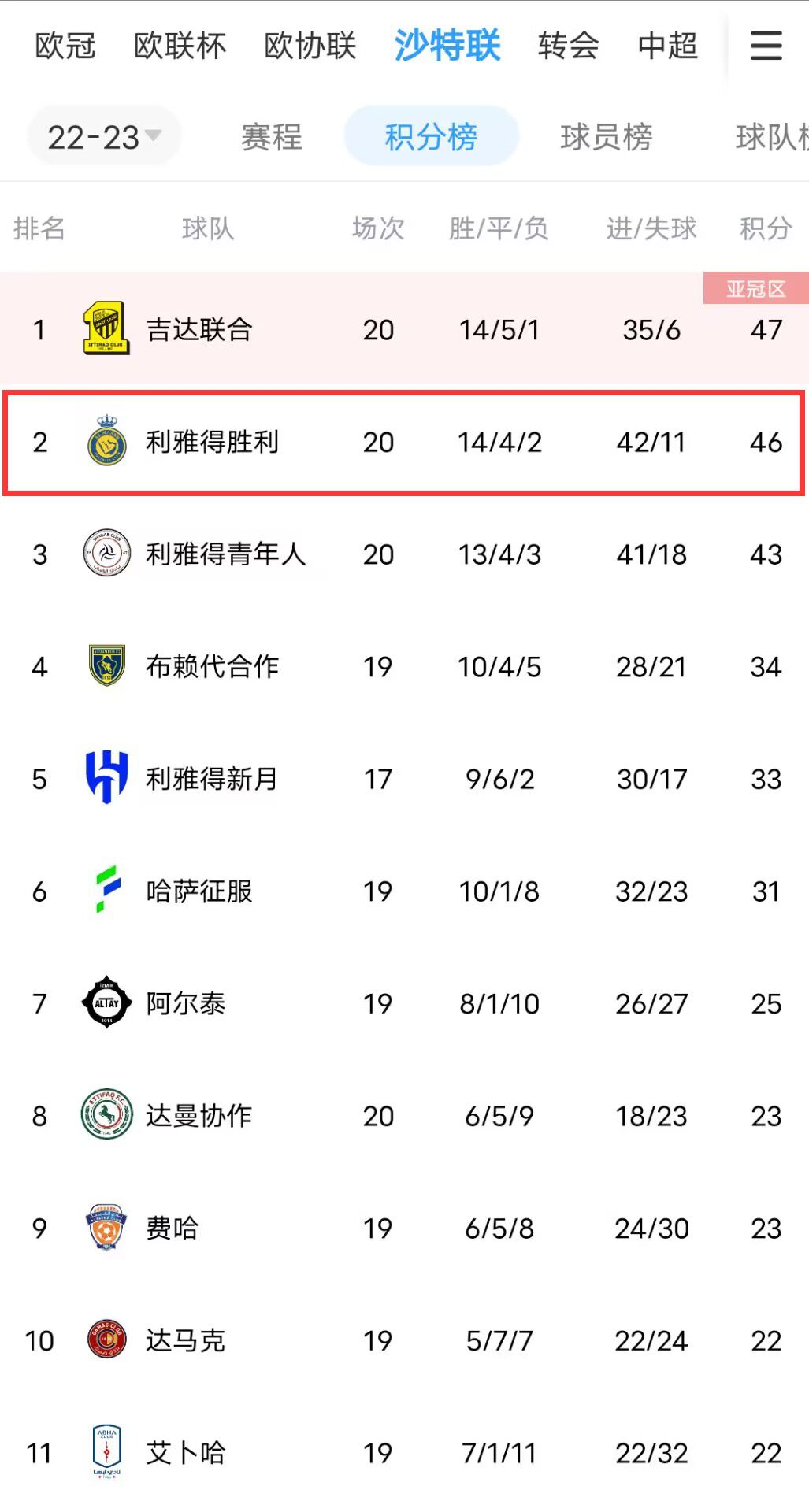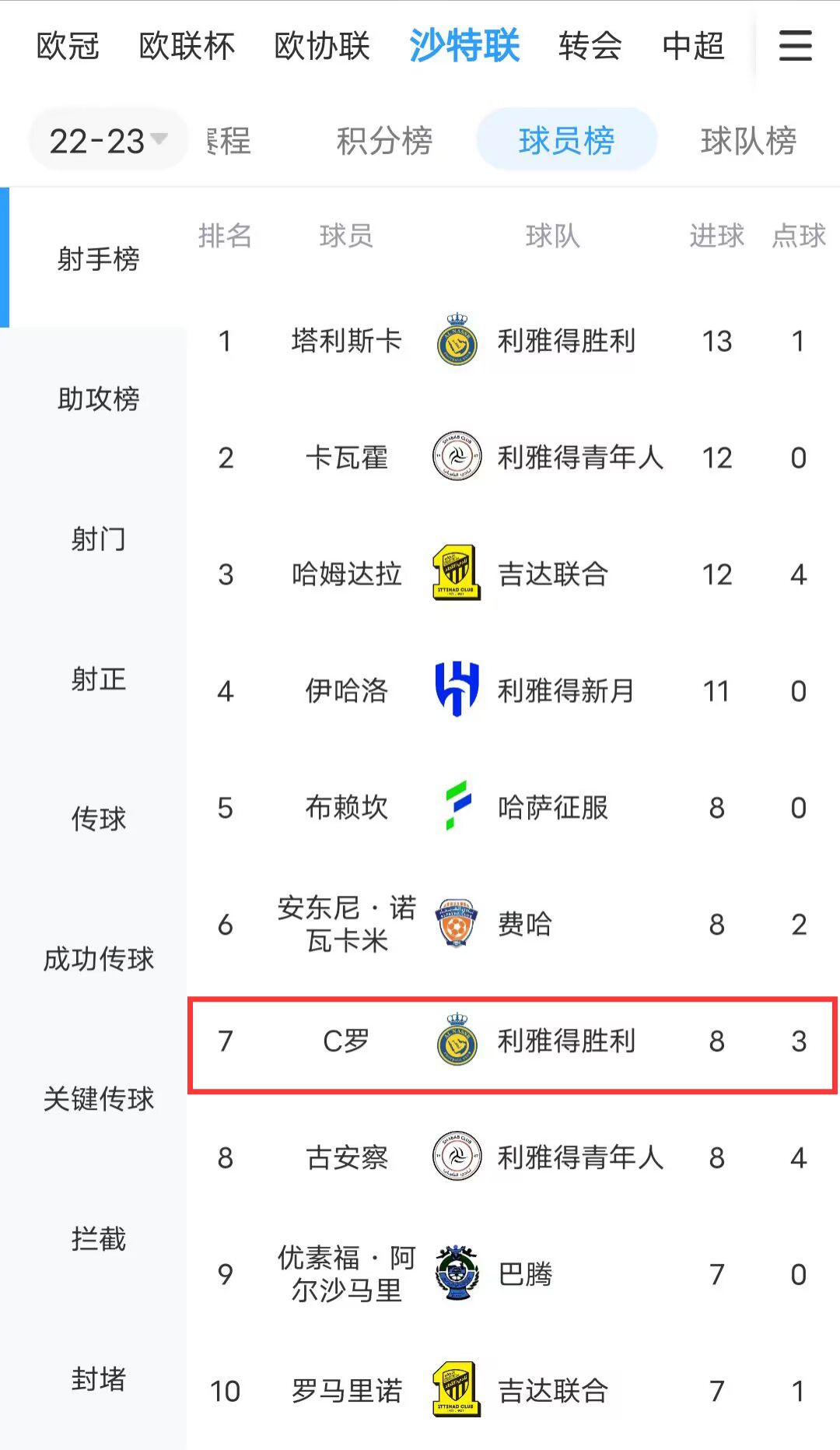 玩球网3月18日讯北京时间3月19日凌晨1点30,沙特联第21轮,利雅得胜利vs艾卜哈。玩球网届时将为广大吧友们带来免费视频直播。 在上一场沙王冠的比赛,利雅得胜利的对手也是艾卜哈,当时C罗的球队以3-1将其击败,顺利挺进杯赛四强。 在联赛射手榜上,C罗打进8球暂时排名第七。 目前,C罗所在的利雅得胜利14胜4平2负积46分排名沙特联赛第二,艾卜哈则是7胜1平11负积22分排名第十一。 沙特联赛积分榜 沙特联赛射手榜 |