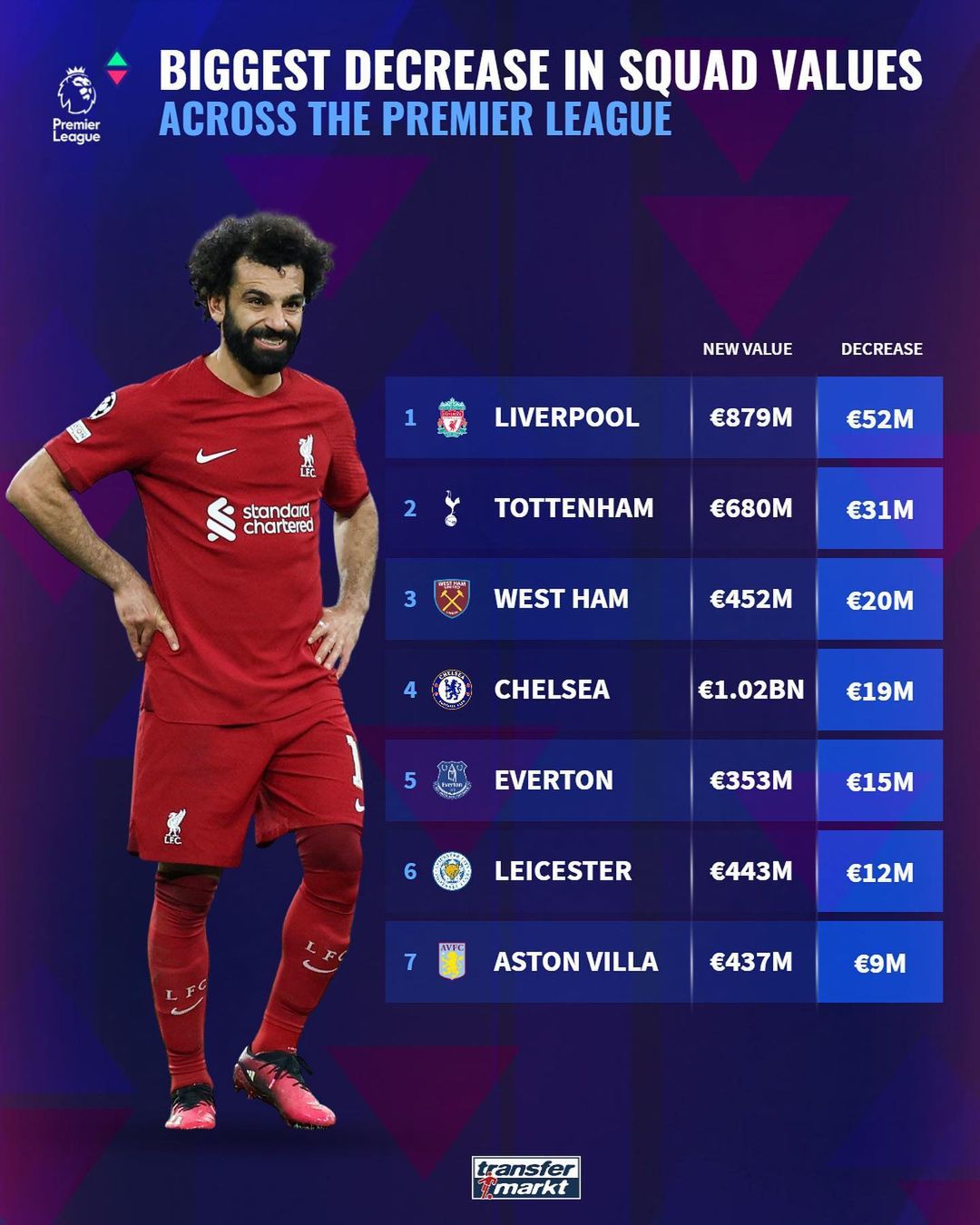 玩球网3月18日讯德国转会市场盘点英超球队最新身价跌幅情况(单位:欧元)。1、利物浦:降5200万现8.79亿2、热刺:降3100万现6.8亿3、西汉姆联:降2000万现4.52亿4、切尔西:降190