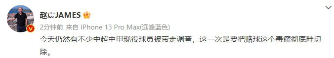 媒体人赵震今日发文:“今天仍然有不少中超中甲现役球员被带走调查,这一次是要把赌球这个毒瘤彻底切除。”