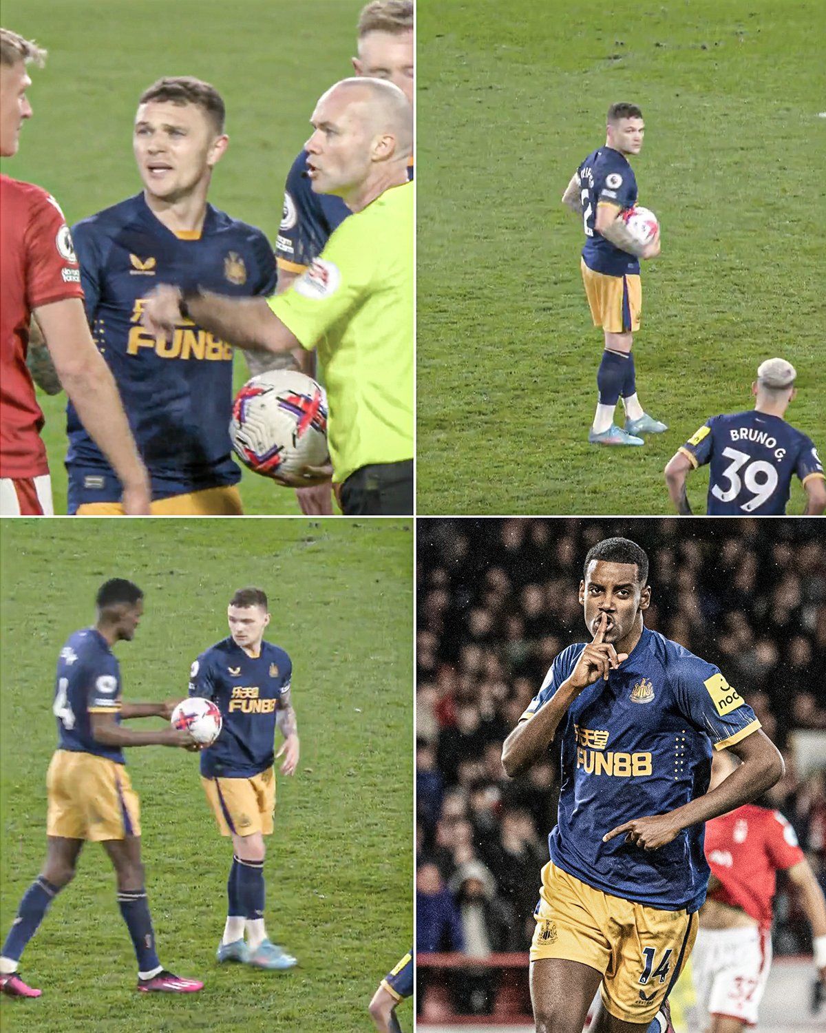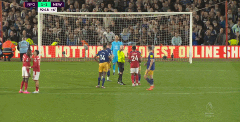 纽卡vs森林第93分钟,特里皮尔假装主罚点球以分散诺丁汉森林的注意力意想不到的是却让给了????????伊萨克打进了比赛的制胜点球,纽卡2-1取胜????????森林手球送点↓特里皮尔抱着球与对手有说有笑↓特里皮尔神色轻松,