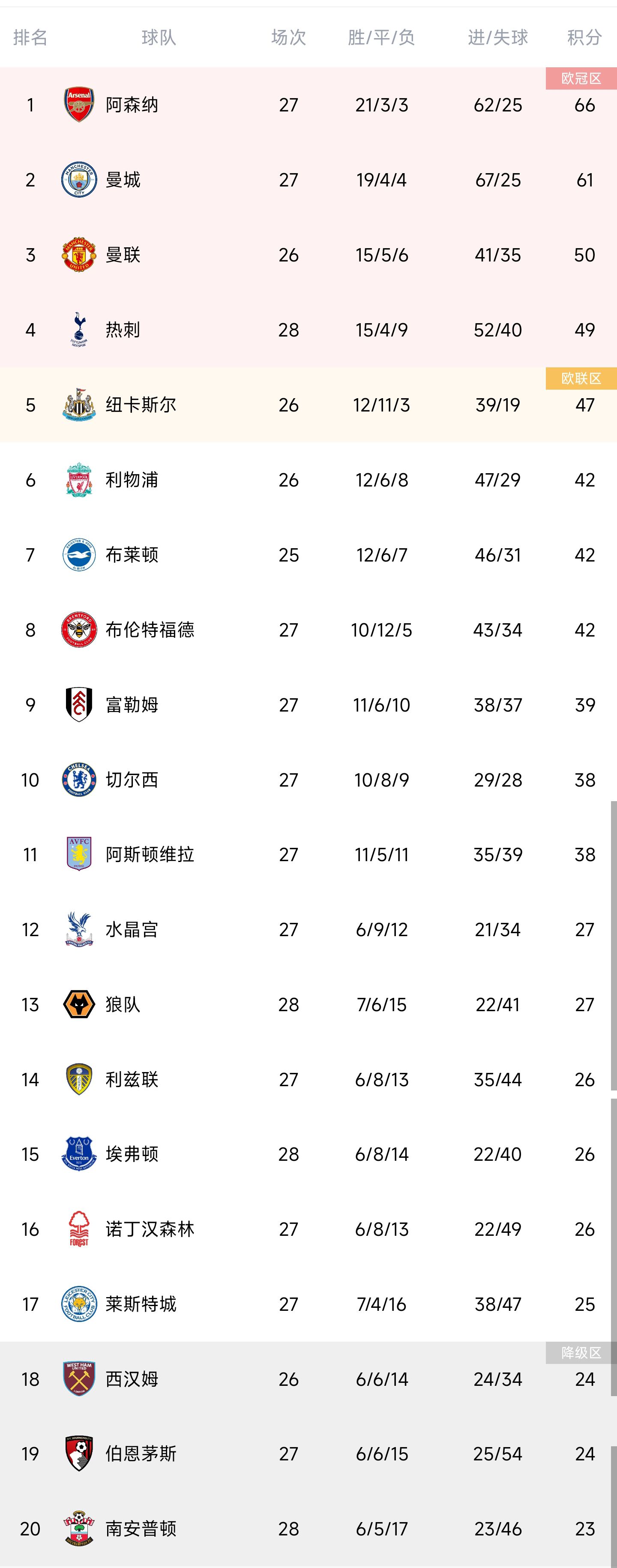 积分榜方面,切尔西仍居第十,热刺居第四多赛两场距曼联一分,阿森纳5分优势领跑,曼城、曼联排在第二、三,利物浦第六。