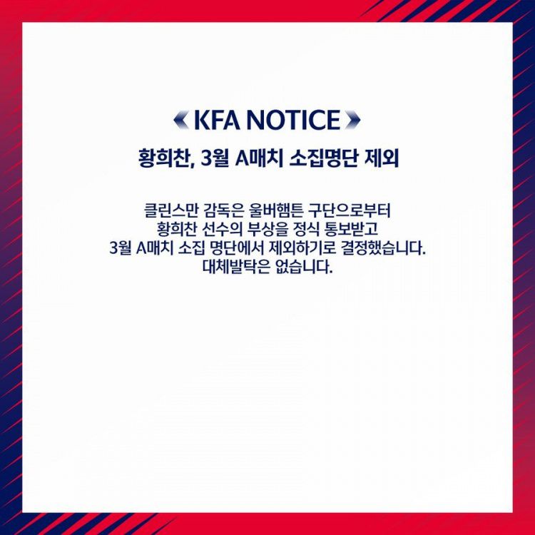 玩球网3月19日讯韩国足协官方宣布,狼队前锋黄喜灿将因伤错过本期国家队的集训。狼队正式通报了黄喜灿受伤的消息,主教练克林斯曼在收到消息后,决定将黄喜灿排除在3月份A级比赛的集训名单之外,但也并未征召其