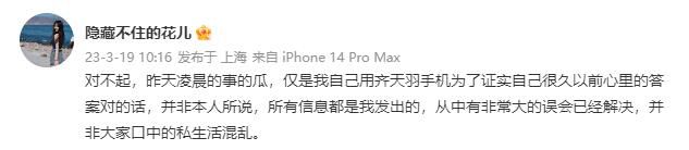 今天凌晨,山东泰山球员齐天羽微博晒出女子照+微信聊天记录,内容暧昧,疑似出轨。 几个小时后,齐天羽妻子发微博道歉:“对不起,昨天凌晨的事的瓜,仅是我自己用齐天羽手机为了证实自己很久以前心里的答案对的话,并非本人所说,所有信息都是我发出的,从中有非常大的误会已经解决,并非大家口中的私生活混乱。” 勘误:小编错将齐天羽妻子微博写成疑似出轨女子微博,特此勘误 【相关新闻】深夜爆瓜????泰山球员齐天羽晒女子照+聊天记录,内容暧昧疑出轨 |