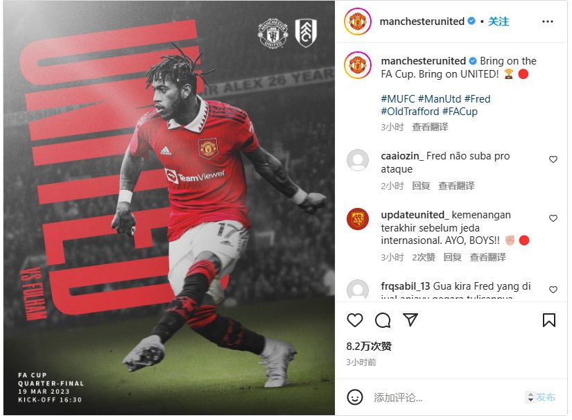 玩球网3月19日讯明天凌晨,曼联将在足总杯1/4决赛迎战富勒姆,红魔今天在社交媒体上发布了赛前海报。