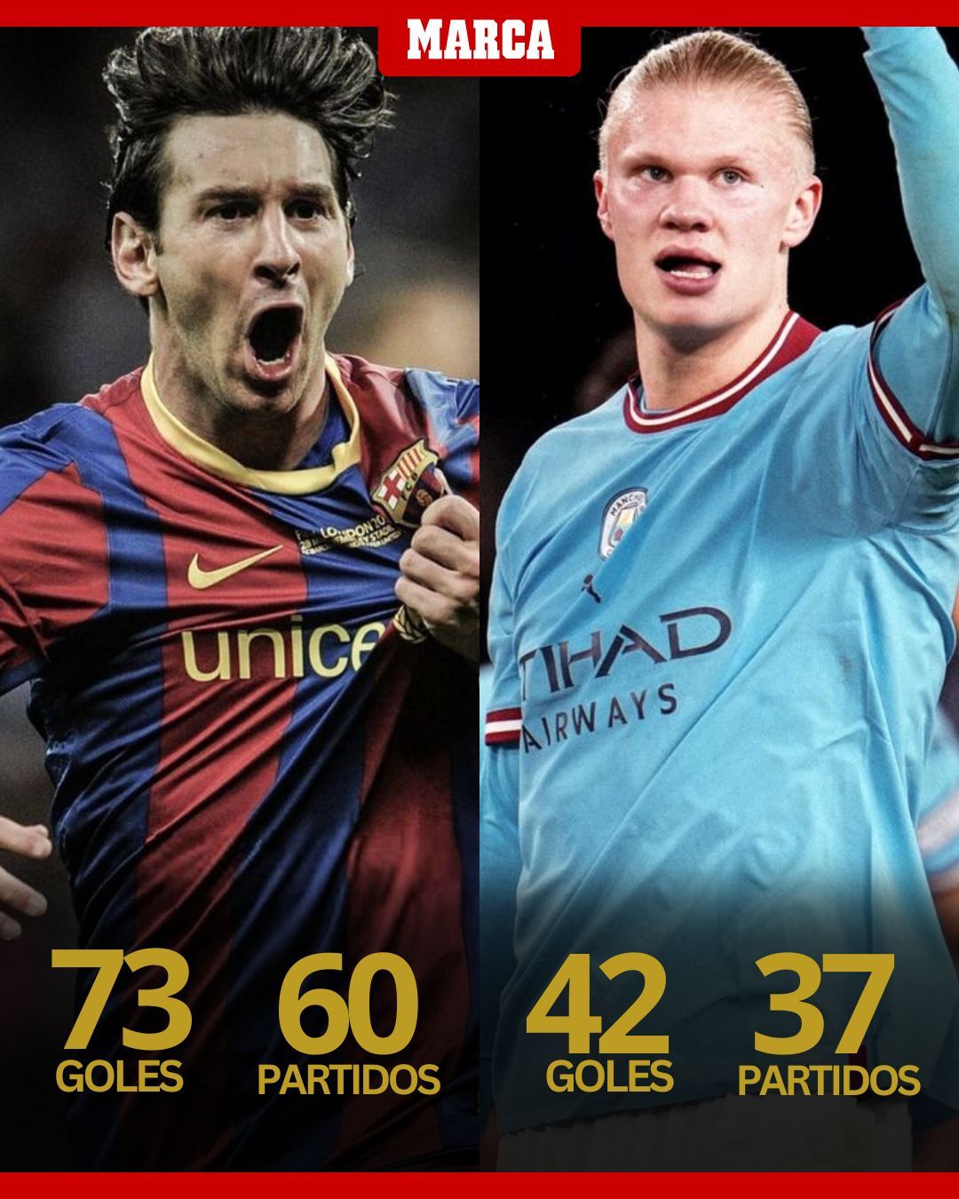 2022-23赛季,哈兰德已代表曼城出场37次,打进42球,场均约1.14球2011-12赛季,梅西代表巴萨出战60场,打进73球,场均约1.22球