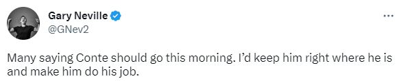 玩球网3月19日讯 英超最新一轮,热刺3-3南安普顿,热刺是在两球领先的情况下被绝平。孔蒂在赛后直接开炮,怒批热刺球员以及整个俱乐部。 此举引起了外界争议,不少人认为热刺应该让孔蒂下课。卡拉格也表示孔蒂就是想被解雇,热刺应立即行动。 内维尔在社媒表达了不同意见:“许多人说孔蒂应该在今天早上就离任。但我会让他留下,让他做好自己的工作。” |