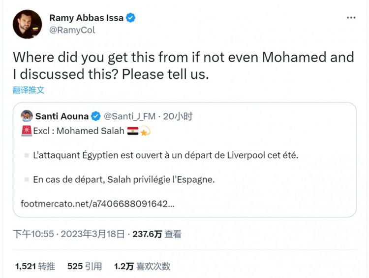 玩球网3月19日讯 法国媒体Foot Mercato表示萨拉赫考虑今夏离开利物浦,球员经纪人在社交媒体上对此进行辟谣。 Foot Mercato在报道中声称萨拉赫考虑今夏离队,而西甲是他的首选目的地。萨拉赫的经纪人Ramy Abbas Issa转发了这条新闻,并写道:“如果萨拉赫和我都没有讨论过这件事,你们是从哪里得到这个消息的?请告诉我们。” 相关新闻: ????法媒:萨拉赫越来越多考虑离开利物浦????西班牙是首选目的地 (木子) |
