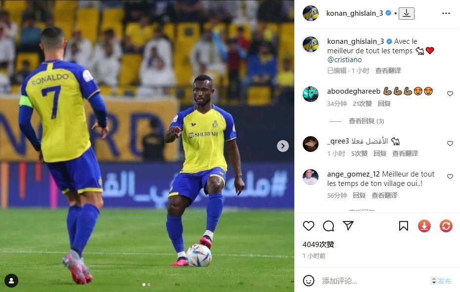 赛后利雅得胜利球员科南社媒晒与C罗合照:“与有史以来最好的????❤️@C罗”