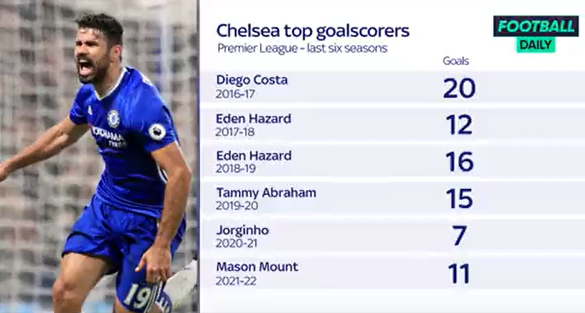 玩球网3月19日讯根据统计,切尔西此前6个赛季英超的单赛季射手王仅1个赛季进球数超过20个。过往6个赛季,切尔西的单赛季射手王分别是迭戈-科斯塔(2016-17赛季,20球)、阿扎尔(2017-18赛
