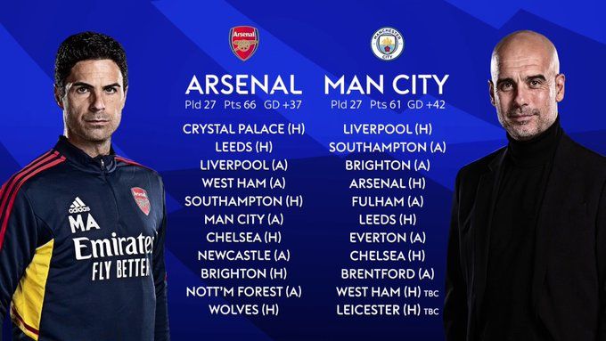 玩球网3月19日讯英超争冠大戏进入白热化阶段,阿森纳以5分的领先优势领跑,曼城紧追其后。在未来的11轮中,双方的赛程难度相近,有一场直接对话,双方都要对阵利物浦和切尔西。此外,曼城还有两回合与拜仁的欧