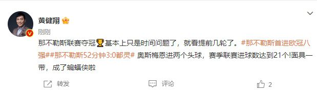 玩球网3月19日讯意甲第27轮,那不勒斯客场挑战都灵。目前那不勒斯3-0领先都灵,奥斯梅恩已经双响。著名解说员黄健翔在社媒对此表达了看法。他说道:那不勒斯联赛夺冠基本上只是时间问题了,就看提前几轮了。