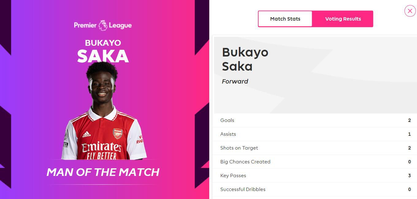 玩球网3月20日讯英超官方消息,萨卡当选阿森纳4-1水晶宫全场最佳球员。阿森纳本轮对阵水晶宫,萨卡2射1传帮助球队4-1取胜,他全场比赛2脚射正便打入2球,还送出3次关键传球。在英超官方全场最佳的投票