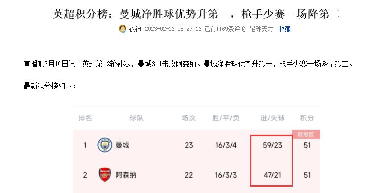 玩球网3月20日讯英超第28轮,阿森纳主场4-1水晶宫,枪手8分领跑积分榜,而且净胜球只比曼城少2个。 2月16日,曼城3-1击败阿森纳,蓝月凭借10个净胜球的优势登顶英超。不过自那之后,阿森纳一波六连胜夺回榜首,拉开分差的同时,净胜球的差距也在缩小,积分榜上的领先优势逐渐扩大。 |