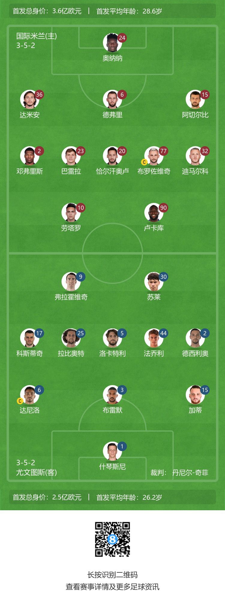 玩球网3月20日讯意甲第27轮焦点战,国米主场迎战尤文比赛即将打响。赛前首发出炉。国米首发:24-奥纳纳、36-达米安、6-德弗里、15-阿切尔比、2-邓弗里斯、23-巴雷拉、77-布罗佐维奇、20-