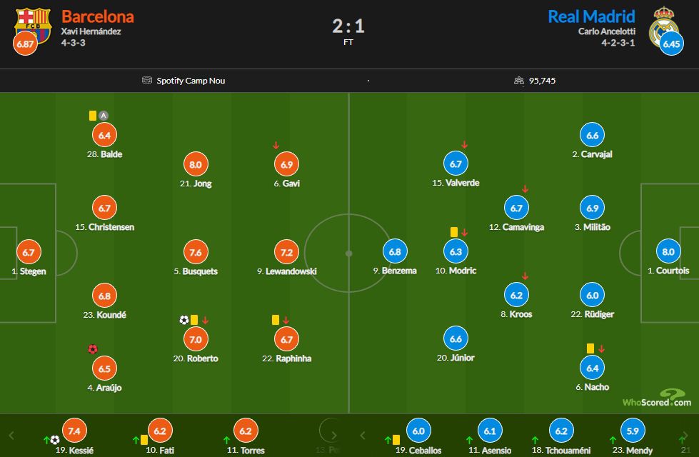 玩球网3月20日讯在刚刚结束的西班牙国家德比中,巴萨主场2比1逆转皇马。在赛后Whoscored的评分中,德容和库尔图瓦并列全场最高的8分,布斯克茨7.6次席,凯西替补绝杀7.4。 详细评分如下: 巴萨:特尔施特根6.7、阿劳霍6.5、孔德6.8、克里斯滕森6.7、巴尔德6.4、德容8.0、布斯克茨7.6、罗贝托7.0、加维6.9、莱万7.2、拉菲尼亚6.7;凯西7.4、法蒂6.2、费兰6.2 皇马:库尔图瓦8.0、卡瓦哈尔6.6、米利唐6.9、吕迪格6.0、纳乔6.4、克罗斯6.2、卡马文加6.7、巴尔韦德6.7、莫德里奇6.3、维尼修斯6.6、本泽马6.8;塞巴略斯6.0、阿森西奥6.1、琼阿梅尼6.2、门迪5.9 |