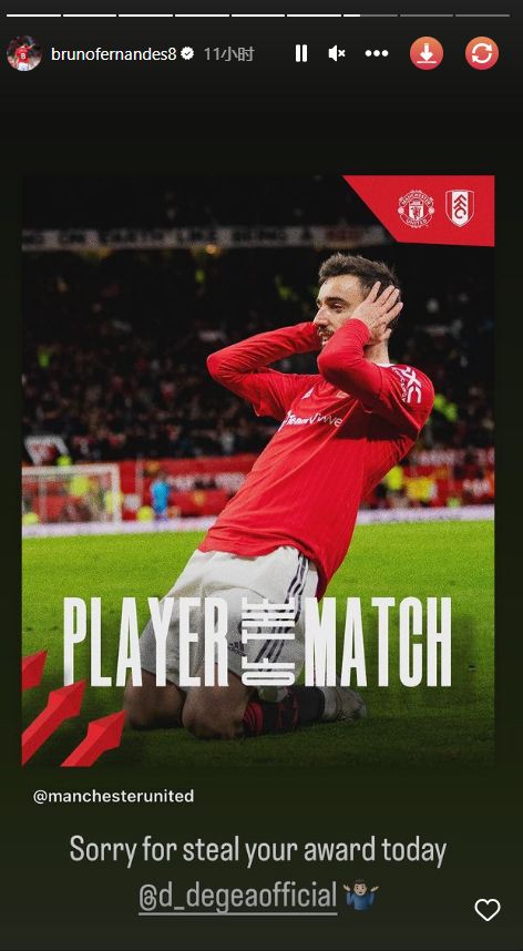 玩球网3月20日讯足总杯1/4决赛,曼联3-1战胜富勒姆,B费双响,获评曼联队内全场最佳,本场德赫亚也表现出色,贡献5次扑救。赛后B费社媒@德赫亚:抱歉今天偷走了你的全场最佳????♂️