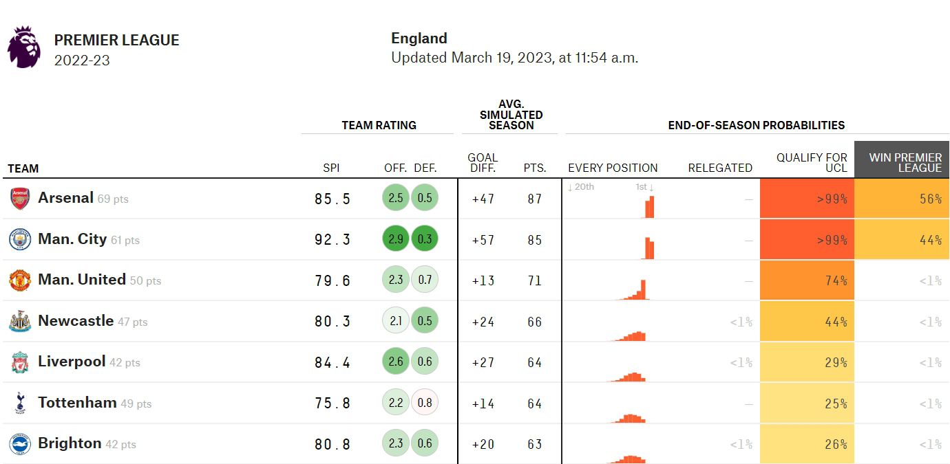 玩球网3月20日讯英超第28轮多场比赛战罢,大数据机构fivethirtyeight更新了对本赛季英超争冠以及保级形势的预测。领头羊阿森纳的夺冠概率攀升到了56%。夺冠概率↓阿森纳:56%曼城:44%