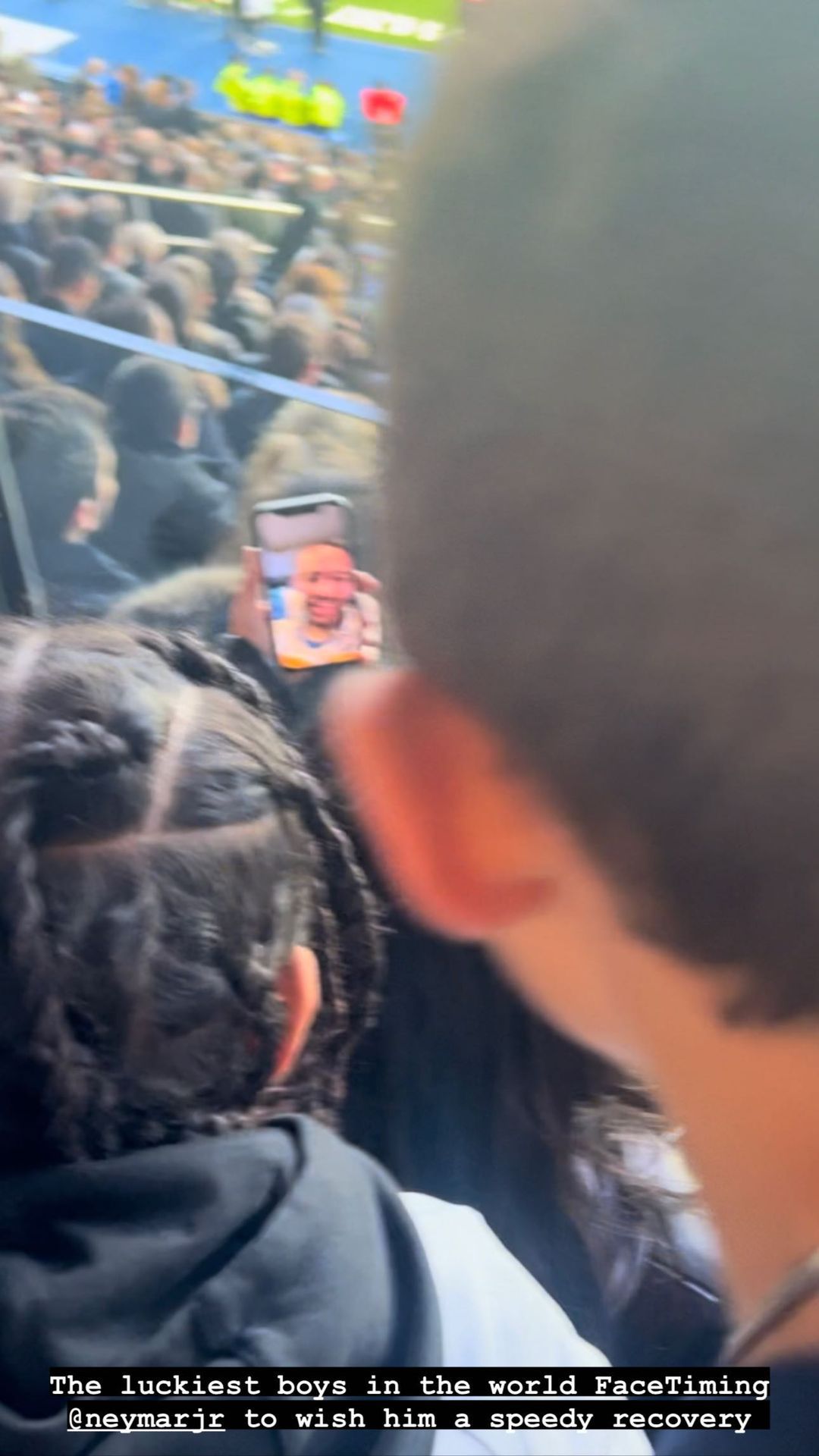 赛后卡戴珊在社媒晒照,孩子在比赛中与内马尔视频,并配文:“世界上最幸运的孩子在与内马尔视频,并祝他早日康复。”