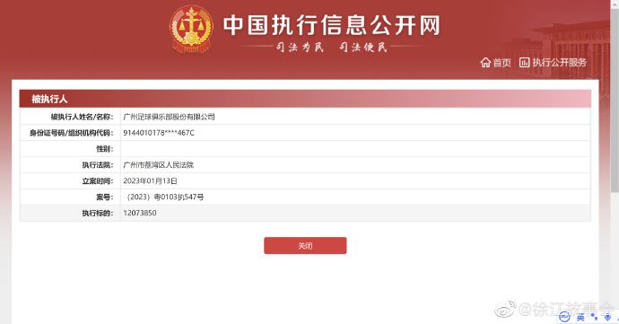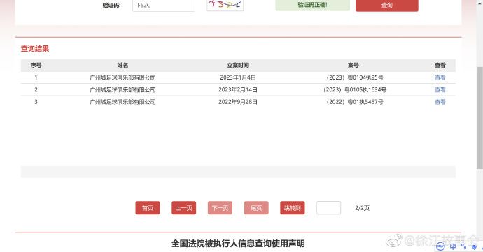 玩球网3月20日讯中国足协公布第二批完成债务清欠俱乐部,其中广州队在列。而媒体人徐江则晒出广州队被执行信息质疑中国足协完成清欠名单的合理性。徐江表示:根据最高人民法院被执行人系统查询可得知,广州俱乐部